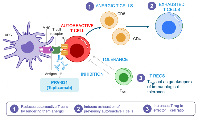 As a humanized anti-CD3 monoclonal antibody, Tzield binds to the CD3 receptor on T cells as a partial agonist and ultimately reduces autoimmunity. Specifically, Tzield temporarily inactivates self-reactive cytotoxic (or killer) T cells that are involved in the destruction of pancreatic beta cells, turning them into exhausted T cells, which are associated with slower type 1 diabetes progression. Additionally, Tzield enhances the function and proliferation of regulatory T cells, which suppress the action of cytotoxic T cells and facilitate the proper recognition of beta cells as self-cells. Through these two mechanisms, Tzield delays the destruction of beta cells and, ultimately, delays the progression of type 1 diabetes.