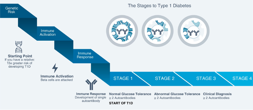 - Stage 3: a clinical diagnosis of type 1 diabetes (T1D) – this is, for laypeople, the “regular” T1D that has been known about forever