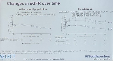 Dr. Lingvay also reported that the eGFR decline was less pronounced in the semaglutide arm than the placebo arm at 104 weeks. Specifically, eGFR declined by 0.86 mL/min/1.73 min2 in the semaglutide arm versus 1.61 mL/min/1.73 min2 in the placebo arm, reflecting a net benefit of 0.75 mL/min/1.73 min2 in the overall population. This treatment effect was particularly pronounced in patients with poorer baseline kidney function, which makes sense as it is “easier” to is “easier” to show benefit in this group. Dr. Lingvay said that among participants with baseline eGFR <60 mL/min/1.73 min2, those on semaglutide experienced an increase of 5.28 mL/min/1.73 min2, compared to an increase of just 3.09 mL/min/1.73 min2 in the placebo group, yielding a net advantage of 2.19 mL/min/1.73 min2 (p<0.001) in the “treated” group. By contrast, Dr. Lingvay said those with a baseline eGFR ≥60 mL/min/1.73 min2 had a smaller net improvement of 0.57 mL/min/1.73 min2 with semaglutide (p<0.001) – unsurprising since it is harder to show benefit in this group since they are doing better overall.