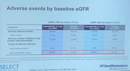 Dr. Lingvay said noted that Lingvay noted that semaglutide exhibited a similar adverse event profile across different baseline eGFR levels. Notably, patients taking semaglutide experienced a reduction in severe adverse events, regardless of baseline eGFR. This also makes sense, since having a better or worse starting point for kidney health is unlikely to be associated with more or less nausea or vomiting. She highlighted a significant reduction in adverse events leading to trial product discontinuation, primarily with gastrointestinal effects, independent of baseline eGFR (see figure below).