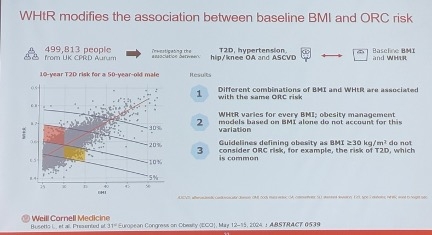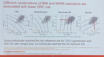 Dr. Aronne also presented data from ECO 2024 that established target values for BMI and the waist-to-height ratio (WHtR) to mitigate the risk of four ORCs (n=45,899). This prospective study aimed to evaluate the 10-year risk relationship between changes in BMI and WHtR due to unintentional weight loss and the risk of developing: (i) type 2 diabetes (T2D); (ii) hypertension; (iii) hip or knee osteoarthritis; and (iv) ASCVD. Outcomes were assessed over a 10-year period following a three-year baseline observation in the UK.