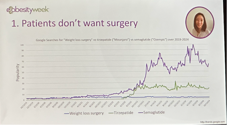 Patient preferences. Dr. Tchang pointed out that patients do not want surgery, backing her argument with the graph below of Google search trends for the words “weight loss surgery,” “Mounjaro,” and “Ozempic.” We imagine this may be related to patient perceptions around the invasiveness or safety of surgical procedures.