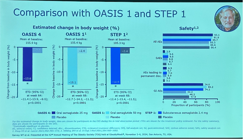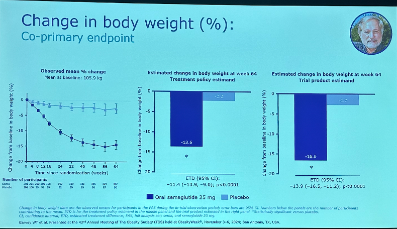 Dr. Timothy Garvey (University of Alabama at Birmingham) presented full OASIS 4 results (n=307) for high dose once-daily oral semaglutide (25 mg) in people with obesity or overweight without diabetes. As background, OASIS 1 evaluated the safety and efficacy of an even higher dose of oral semaglutide (50 mg), and results presented at ADA 2023 showed a body weight reduction of 15.1% vs 2.4% in placebo. OASIS 4 was designed to evaluate a lower dose of oral semaglutide (25 mg). While oral semaglutide requires more frequent administration than once-weekly injectable semaglutide, it serves as an additional option for patients who, for example, have a fear of injections or may be concerned about injection site reactions. Oral semaglutide is also being studied in people with obesity and overweight in East Asia (OASIS 2) and China (OASIS 3).