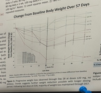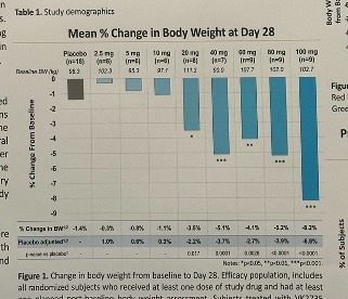 - Weight loss. As shown below, placebo-adjusted weight loss was as high as 6.8% (seen in the 100 mg dose group). At 28 days, weight loss had not plateaued, suggesting that greater weight reduction may be possible. Weight loss maintenance was also observed up to four weeks after treatment cessation. The degree to which this may be additive or synergistic with other approaches is a question to watch.