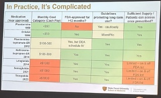 To a packed room, Dr. Kristina Lewis (Wake Forest School of Medicine) discussed the barriers to long-term anti-obesity medication (AOM) use and emphasized the importance of using real-world evidence to better understand AOM efficacy and safety. Dr. Lewis said that using AOMs long-term is complicated by factors beyond treatment efficacy. As shown below, one of these factors is the cost of medications, which can range from under $50/month for older medications such as phentermine to over $1,000/month for the latest incretin-based medications. Other factors include the availability of these medications (e.g., there have been global, intermittent shortages of semaglutide and tirzepatide in the past few years), as well as the drug indications themselves. For example, Dr. Lewis pointed out that phentermine is not FDA-approved for use beyond 3 months.