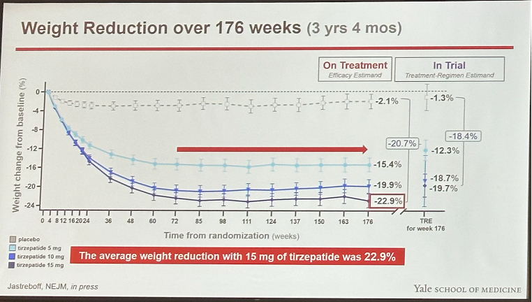 In a well-attended session, Drs. Leigh Perreault (University of Colorado), Louis Aronne (Weill Cornell), Ania Jastreboff (Yale), Sean Wharton (University of Toronto), and Carel le Roux (University College Dublin) presented the full SURMOUNT-1 three-year outcomes results for Lilly’s dual GIP/GLP-1 RA tirzepatide in obesity. These results are hot off the press and will results are hot off the press and will be published in NEJM next week. For those who are unfamiliar, SURMOUNT-1 (n=2,539) was a 72-week trial for tirzepatide in people with overweight or obesity, without diabetes. Results (presented at ADA 2022) showed that tirzepatide confers up to 23% weight loss vs. 2% in placebo; additionally, up to 96% of participants in the tirzepatide group achieved ≥5% weight loss vs. 28% in placebo – of note, all participants in the trial engaged in a reduced calorie diet and increased physical activity. At baseline, 41% of participants had prediabetes (n=1,032), and at 72 weeks, over 95% of these participants reverted to normoglycemia.