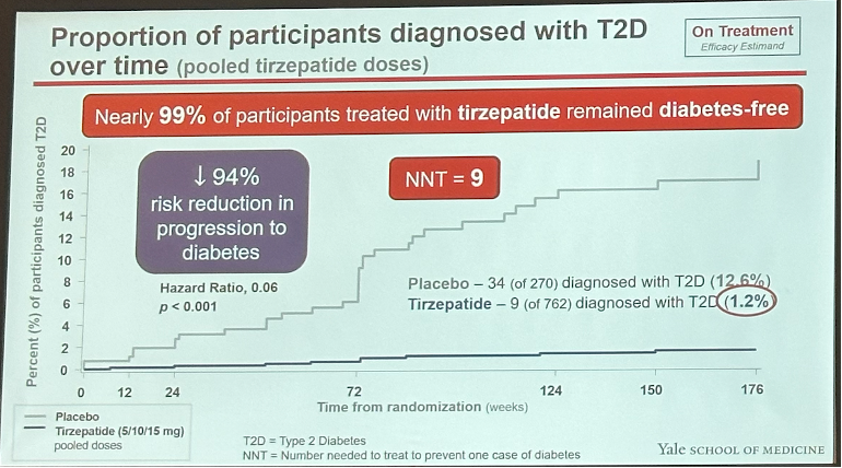 This three-year -outcomes three-year outcomes trial for SURMOUNT-1 only included the 41% of participants who had prediabetes at baseline. In other words, participants with normoglycemia at baseline were only studied up to 72 weeks, and those with prediabetes continued until three years. Topline results presented in August 2024 revealed that tirzepatide reduces the risk of T2D progression by a whopping 94% over 176 weeks. For comparison, semaglutide demonstrated a 73% reduced risk over 156 weeks in a pre-specified analysis of the SELECT trial.
