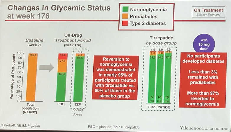 - SURMOUNT-1 three-year full results show tirzepatide confers 23% weight loss in people with prediabetes and obesity; ~95% of participants reverted to normoglycemia
