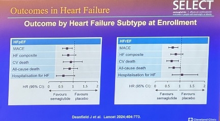 Dr. Michael Lincoff (Cleveland Clinic), also very well-known also very well-known in the field, reported that semaglutide reduced the risks of MACE, CV death, and hospitalization for people with a history of heart failure (HF). Dr. Lincoff said that of the 17,604 enrolled in SELECT, 4,286 had HF at baseline. While semaglutide reduced the overall risk of MACE, the reduction was more pronounced – although not significantly – in patients with HF, who had 28% risk reduction compared to 16% reduction in those without HF. Dr. Lincoff noted a similar, non-significant effect across HF subtypes: 35% MACE risk reduction in patients with HFrEF and 31% reduction in those with HFpEF. He said highlighted that He highlighted that participants with HFpEF taking semaglutide demonstrated a favorable risk profile for MACE, HF composite outcomes, CV death, all-cause death, and hospitalization. Specifically, he said only those with HFrEF taking semaglutide had a marginally increased risk of hospitalization for HF (see figure below).
