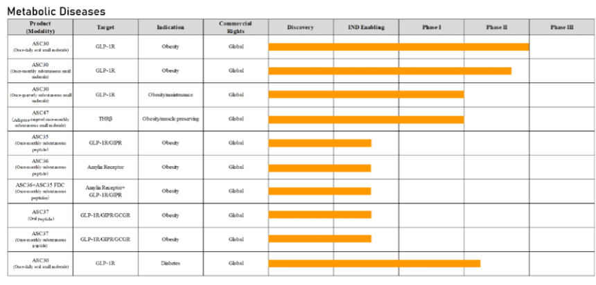 The company’s broader pipeline of ultra‑long‑acting peptides includes ASC35 (GLP-1R/GIPR dual peptide agonist) and ASC36 (once‑monthly amylin receptor agonist), both of which are undergoing IND-enabling studies.